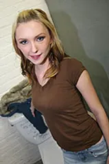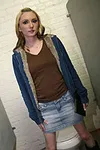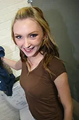 At 20 years of age Amy Quinn can't set foot inside a bar, but the gloryhole is another thing. She's about to turn dine on her first black cock while not knowing who belongs to the black tree trunk. Amy's fascination with interracial sex began after an online search of interracial porn brought her here. The mystique of anonymous sex with a big black cock was too much to pass up. While waiting for a hung black cock to make her acquaintance Amy sets the mood by caressing her entire body that results in a stellar orgasm. Amy's wait isn't too long and the rumored black cock finally makes its appearance. Amy's tiny little legs keep her equally small frame up as she sucks down as much black cock as her mouth can take. After a thorough spit shine Amy props herself up and forgoes the condom she brought with her. After all, she's gone this far so why not do it right and have her vaginal walls get massaged by bare, black meat? Amy's blond hair whips around in a frenzy as her pussy gets bulldozed by the black cock coming from the wall. Amy's raunchy evening of interracial sex concludes when the black snake shots its venom right on her pretty,little face.