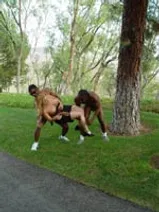 Holly has been on Howard Stern many times talking about her black slut ways. Howard is fascinated by Holly and her dark cravings. Her naughtiness turns on every man we think, black or white! We shot this scene in a greenbelt right next to a busy road! Watch the look on the driver's face of the cars that slow down for a look. All 5 bro's take turns gaping this interracial slut and then take turns coating her face with their black baby making seed. She LOVED it.