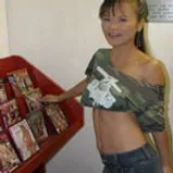 Mia Smiles has made a trip from the Far East to the West Side with images of interracial fucking in her head. After browsing many adult titles Mia sits herself into a nearby booth with an obvious hole cut out in one of the walls. She didn't think much of it as every stitch of clothing hit the floor to reveal a tight body. Just gazing up and down her tiny package takes us from dick sucking lips to a pussy dripping wet from this lewd conduct she's engaging in. It looks as if she's made enough noise to attract the attention of a patron of the store whose ethnicity is not in doubt. Her rapid heart beat goes up a few levels as you can hear the gears in her head turn. Does she run out of the booth and inform the Authorities? No. Like a true black cock slut she inspects his cock prior to her taking him in her mouth. You can't help but wonder what would bring this gorgeous young thing to her knees but the sight of a black dick made her drop all common sense she once had. Her nose nearly meets the wall while her mouth turns his black dick into a shiny black missile. She wouldn't live up to her reputation of being a fiend for black cock if she didn't drain him of all his spunk.....would it?