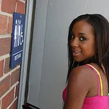 Today's feast for the eyes is Monicka Jaymes. She's slender, sexy, and most importantly, completely naive. The fact that she's in the wrong side of town AND willing to go to this subhuman bathroom only tells us that she's down for just about anything. Once inside Monicka inspects the complete filth surrounding her as well as the putrid writing on the walls. The dirty words only inspire her to lose her top which has been housing two of the perkiest titties ever. Next, her shorts come off to reveal a smooth, bald, black pussy that has yet to feel the stabbing of a white cock. After using her fingertips to explore every inch of her tiny frame she's met with a white dick that is as long as her forearms. Monicka's devilish grin indicates that she's going to party with that cock in her mouth. With her knees just inches from a stranger's sneakers Monicka gobbles his white meat stick while moans bounce off all the walls. Next up on the menu is some interracial sex that Monicka has no problem with since she's been wanting to stretch her pussy out. This black fuck puppet arched her ass in the air so that the stranger behind the wall could get the deepest penetration on that black hole. Monicka's day ends when white cock hoses down her face which will make it awkward when she gets back outside.