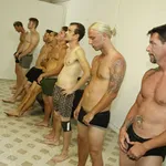Turn your head and cough. I'm sure you've heard that one before. I bet you haven't lined up in a room with a bunch of other men. These poor guys work for one of the cheapest corporations of all time; in fact, it's so cheap, they're conducting physicals on 8 men at a time to make it "cost effective". Another cost-cutting procedure includes hiring a physician's assistant to take care of anything that doesn't require a doctor. Some of Nadia Jay's responsibilities today include taking pressure, weigh in's, and temperatures. She'll need to perform the simple hernia exam, too, which is where things go awry. Soon there's 8 big, white cocks inches near her face, and they're erect and ready to give semen samples, too! Even though it's not part of today's exam, Nadia will accept all 8 samples -- all over her pretty face.