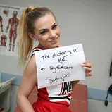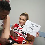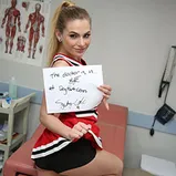Sydney Cole is a "flyer". If you don't know much about the cheer squad, you might not know the flyer: she's the girl they toss high up into the air. Flyers have to be petite, and at 5'2" and not even 100 pounds, Sydney is tiny. She also has a problem: during a particularly difficult maneuver towards the end of the big game, the cheerleaders dropped Sydney! The fall left a deep bruise on her leg, which lead her to Urgent Care..and Dr. Jax! Dr. Jax is a tall and fit and black, which caused Sydney's little pink pussy to wet-up with desire. One look at the good doctor, and she didn't even feel the pain anymore! And let's face it, it's tough to decline a cute, blonde cheerleader when she makes a pass at you! With an empty Urgent Care center, Dr. Jax takes Sydney's lead and runs with it, fucking her very tight, tiny white cunt right in his exam room! Sydney forgets all about her boyfriend as Dr. Jax and his enormous black dick has his way with her...until he paint's her face with a sticky load! Touchdown for Dr. Jax!!